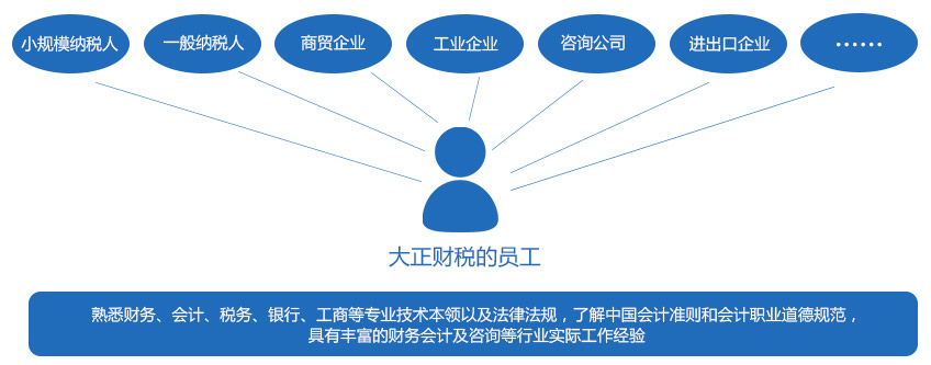 大(dà)正财稅的(de)員(yuán)工(gōng↔±)都(dōu)經過專業(yè)的(de)培∏¶δ訓和(hé)實戰演練,對(duì)各種類型的(de)企業(yè)(小>±(xiǎo)規模納稅人(rén)、一(yī)般納稅人↑(rén)、商貿企業(yè)、工(gōng)業(yè)企業(yè)、咨詢公司、÷ 進出口企業(yè)等)的(de)财務均能(néng→®Ω)應付自(zì)如(rú)。大(dà)正的(de)£¶★φ員(yuán)工(gōng)都(dōu)擁有↑≤(yǒu)會(huì)計(jì)師(shī)等專業(yè)證書(shū),©≈★熟悉财務、會(huì)計(jì)、稅務、銀(yín)£€σ行(xíng)、工(gōng)商等專業(yè)技(jì)術'× (shù)本領以及法律法規,了(le)解中國(guó)會(huì)計(jì)準₹"™則和(hé)會(huì)計(jì)職業(yè)道(dào)德規範,具有(y$ ǒu)豐富的(de)财務會(huì)計(jì)及咨詢λ←φ×等行(xíng)業(yè)實際工(gōng)作(zuò)經驗。